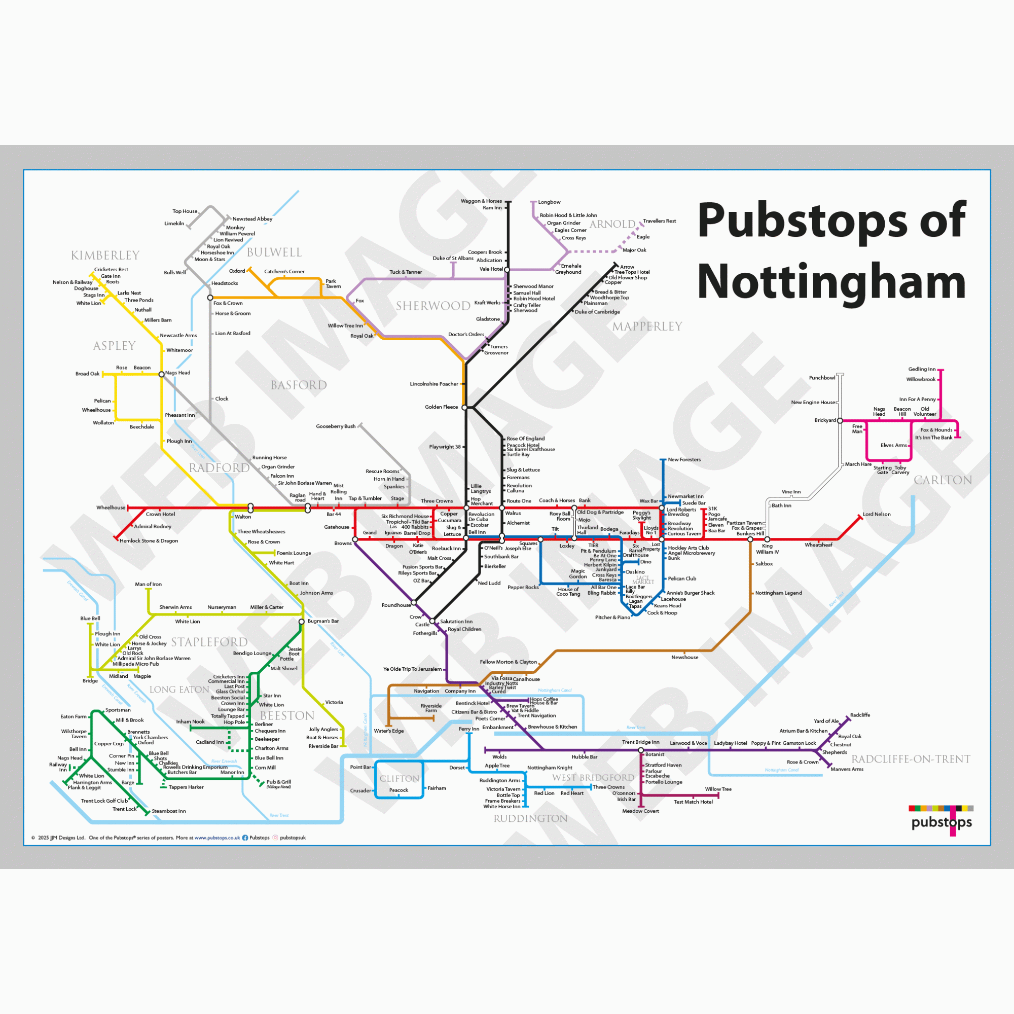 The Pubstops of Nottingham poster in a White Ash Frame. Print size 70cm x 50cm. Please click on ‘Frame Information’ for a more detailed look at the fr..