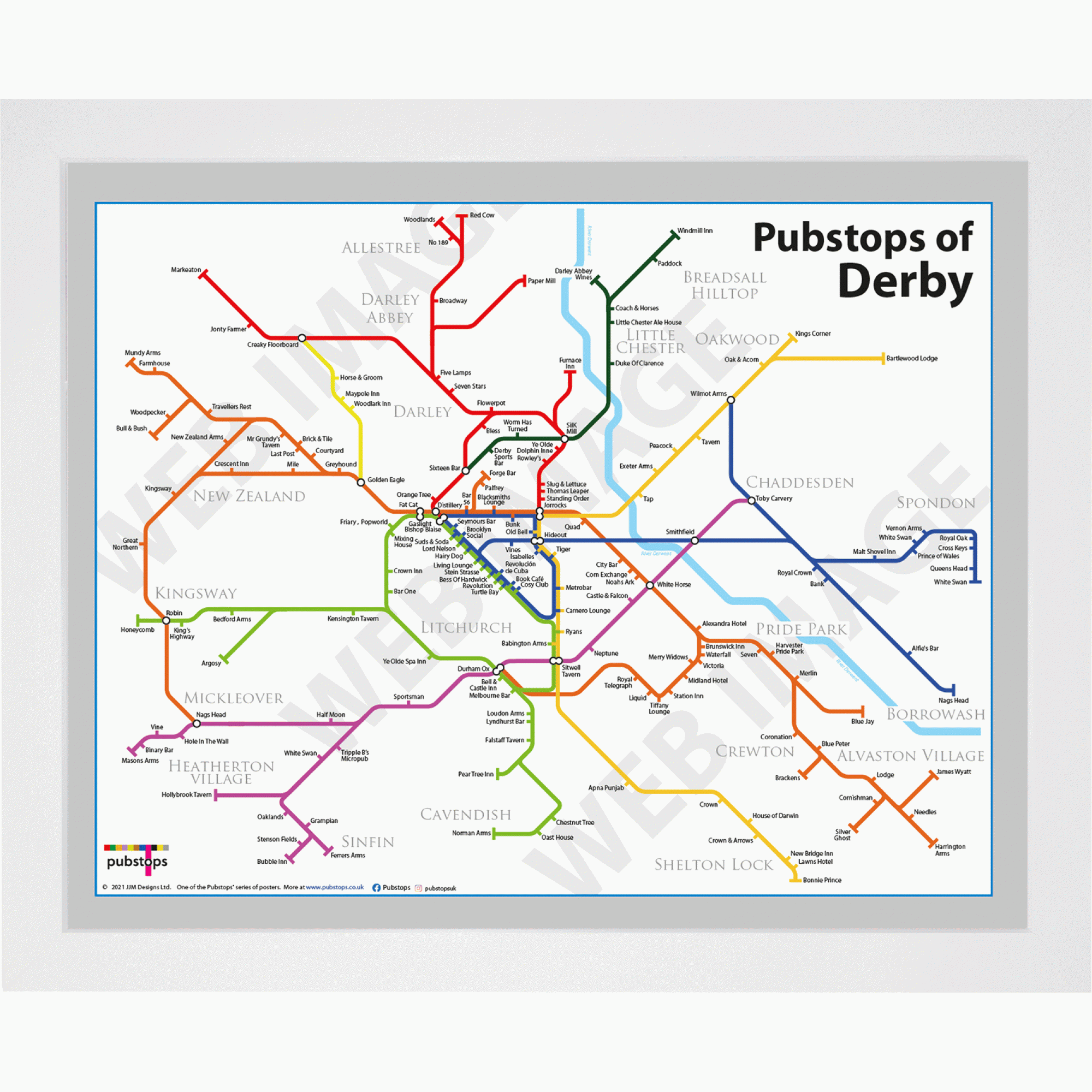 The Pubstops of Derby poster in a White Ash Frame. Print size 50cm x 40cm. Please click on ‘Frame Information’ for a more detailed look at the frames and overall sizes.