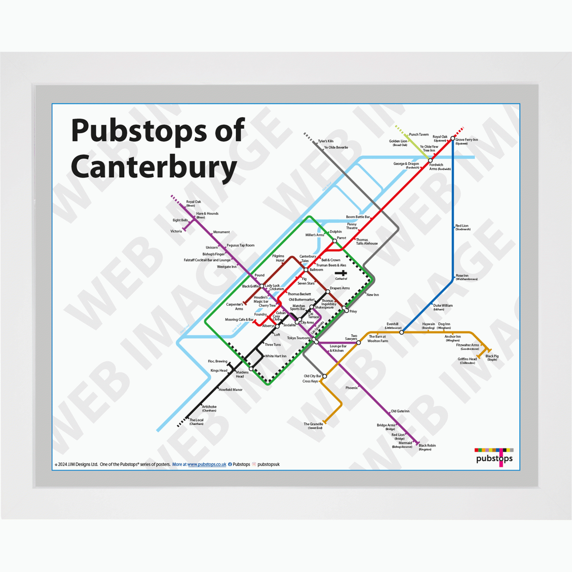 The Pubstops of Canterbury poster in a White Ash Frame. Print size 50cm x 40cm. Please click on ‘Frame Information’ for a more detailed look at the frames and overall sizes.