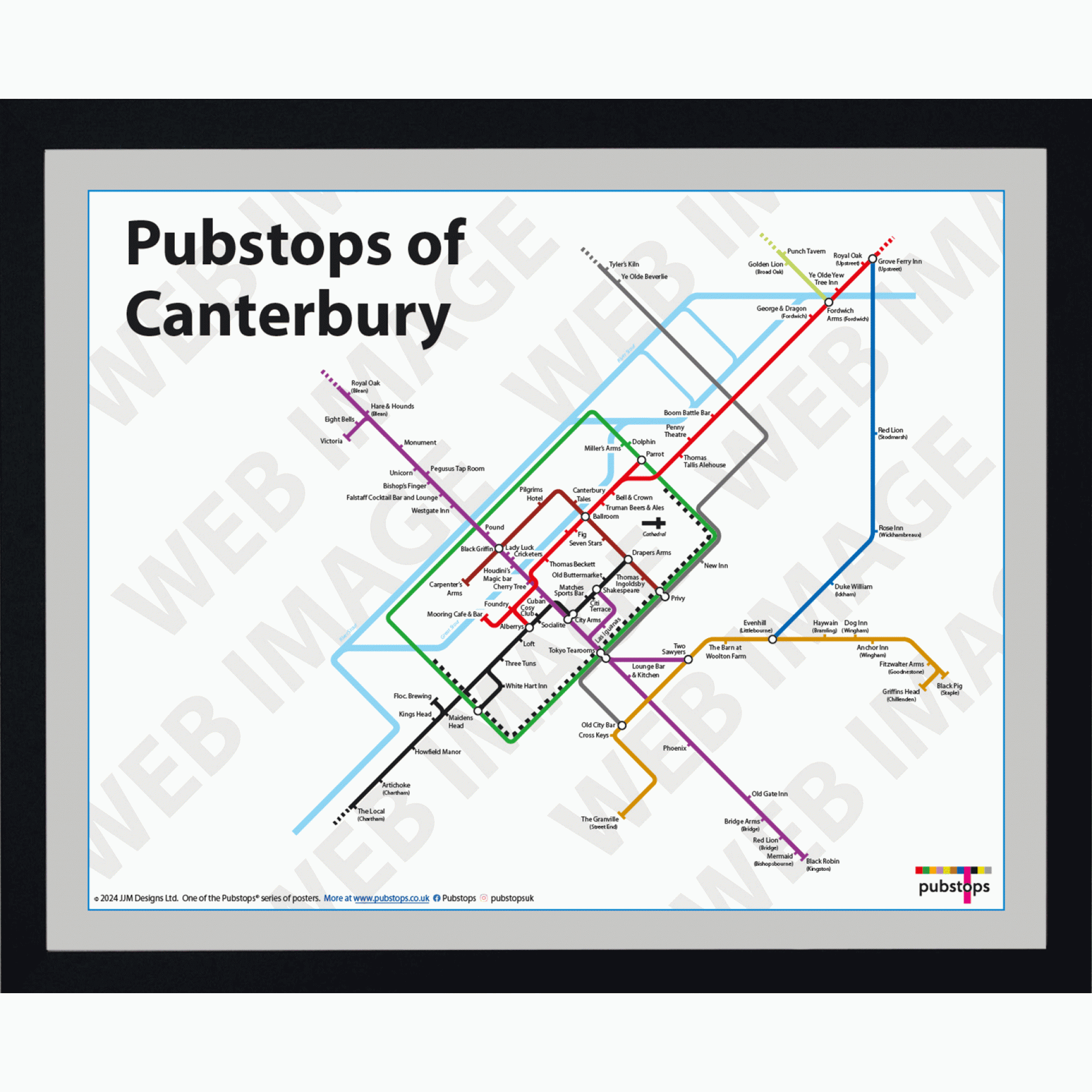 The Pubstops of Canterbury poster in a Black Ash Frame. Print size 50cm x 40cm. Please click on ‘Frame Information’ for a more detailed look at the frames and overall sizes.